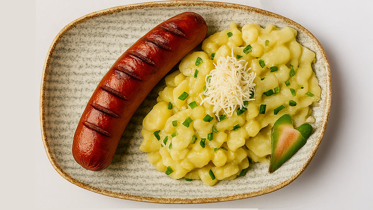 Pausenhof Burger with cheddar, crispy fried onions, tomato & BBQ sauce
